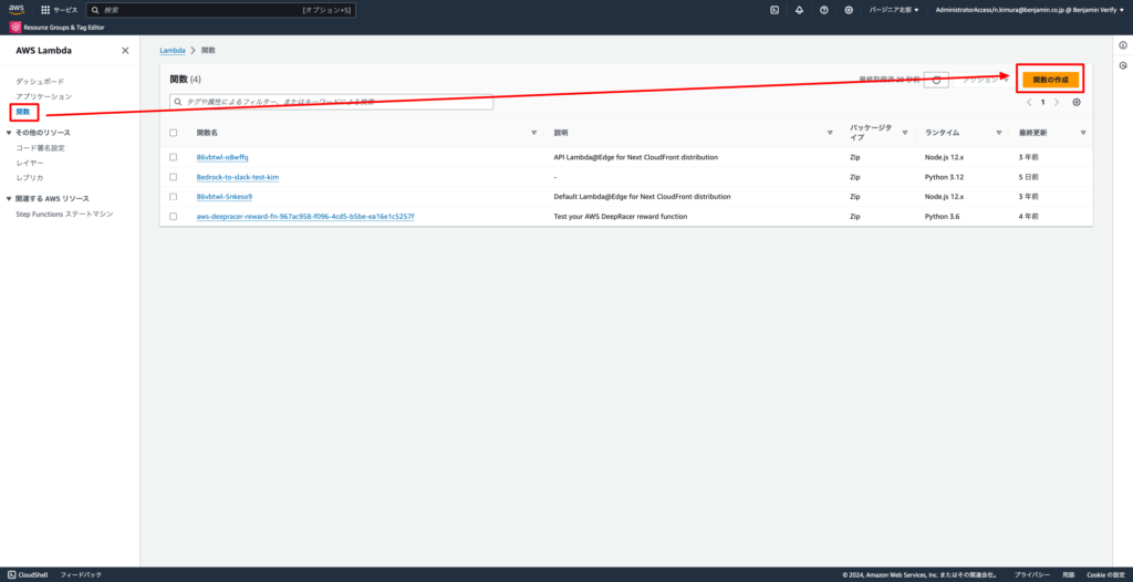 4-2. 左ペインの「関数」をクリックし、「関数の作成」をクリック
