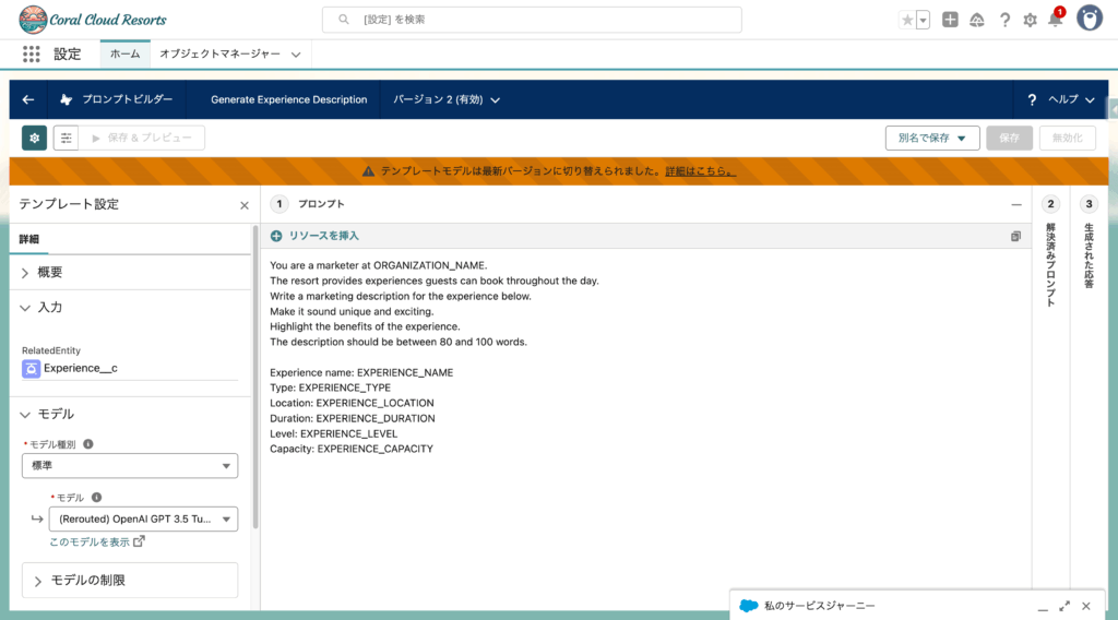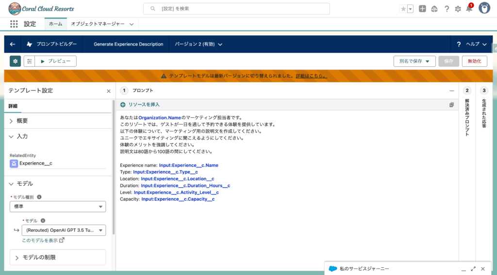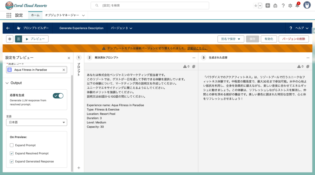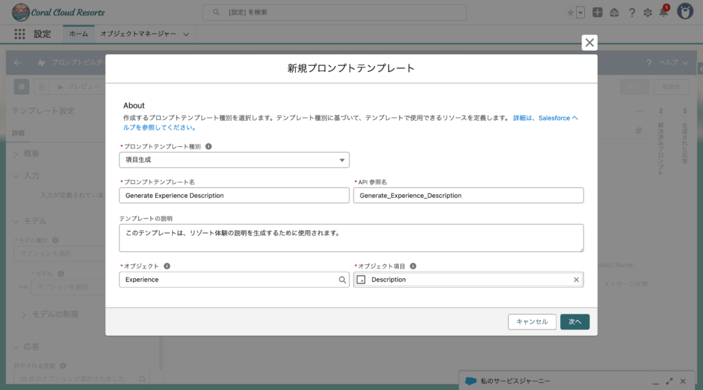 この記事では、Coral Cloud Resortsの体験説明文を自動生成する演習を通して、フィールド生成テンプレートの作成から利用までの手順を分かりやすく解説します。