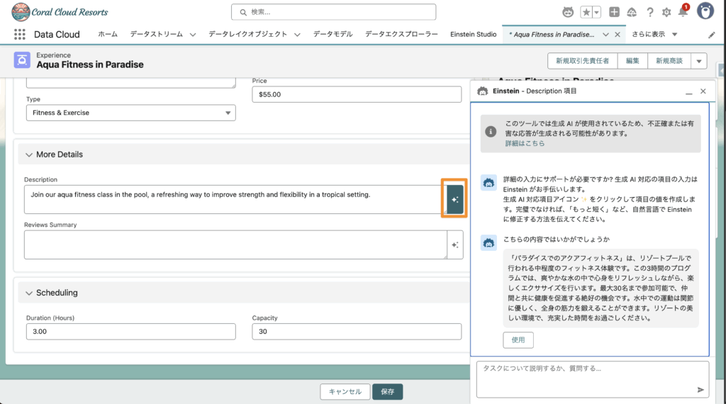 この機能を使えば、特定のリゾート体験(例えば、ビーチヨガリトリートやアクアフィットネスなど)の説明文をAIが自動で生成してくれます。