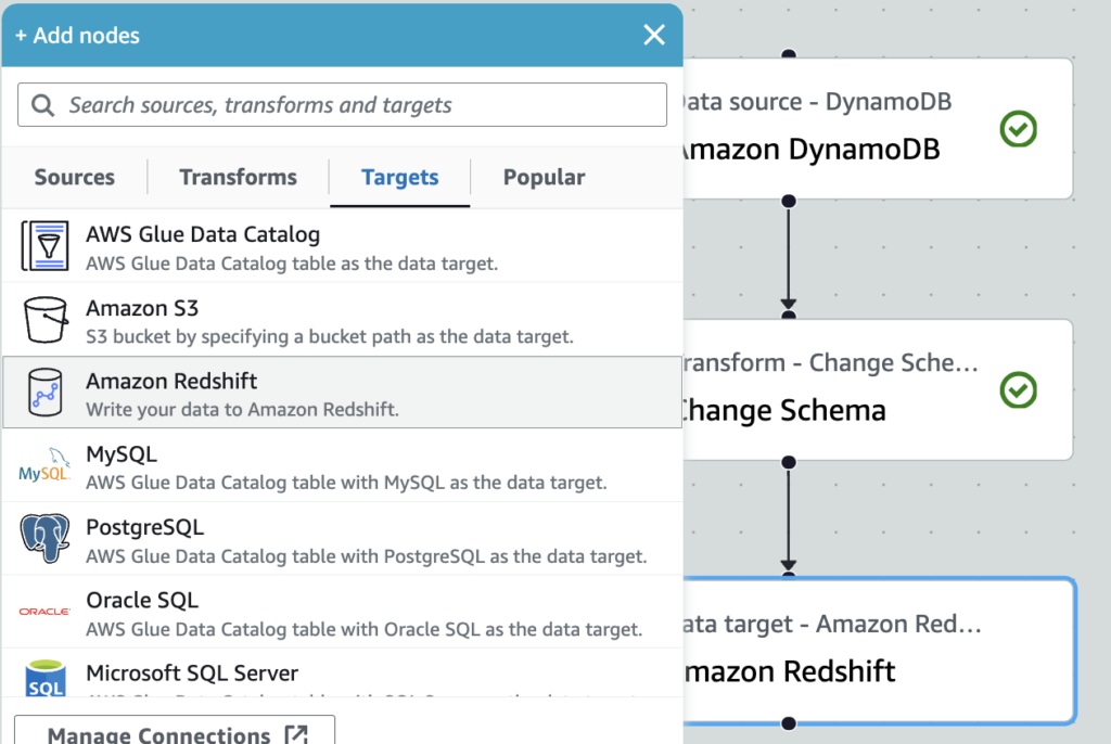 6.Add nodes(左上の➕ボタン)をクリックし、Amazon Redshiftをクリック