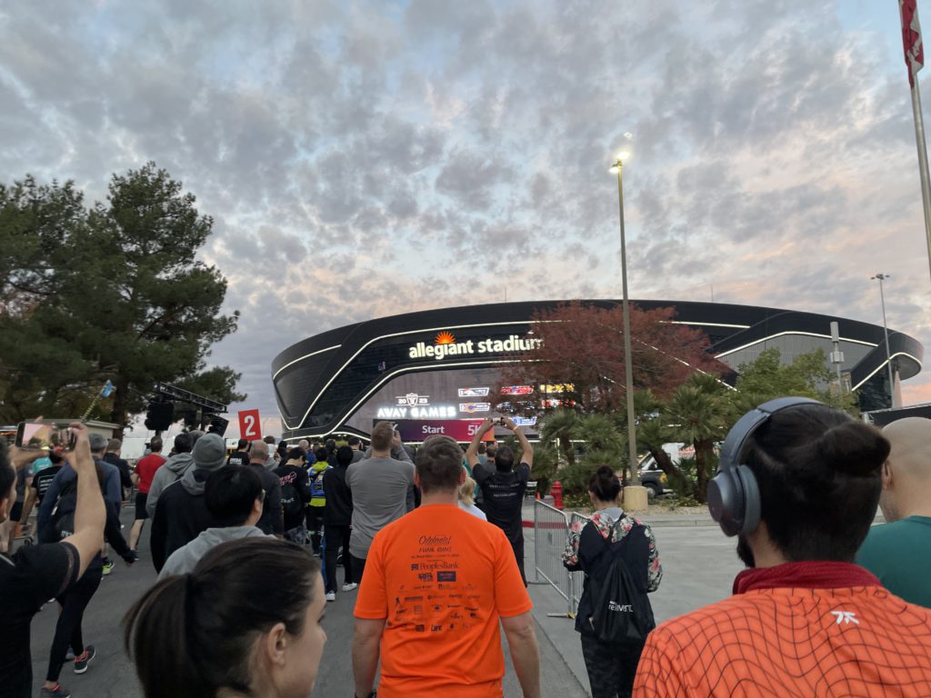 スタートでは会場のスタッフが盛り上げてくれます。allegiant stadiumが朝焼けので綺麗なところからスタートです!気持ちも環境も最高潮の中スタートできるので、私は勢いよく飛ばし過ぎてしまいました。