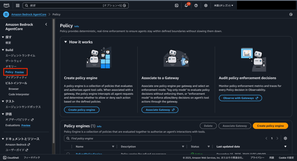 AgentCore Policyは、現時点(2025年12月時点)でプレビュー版として提供されています。