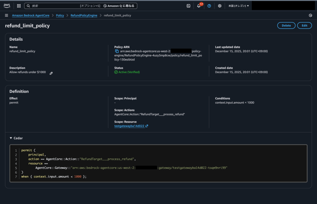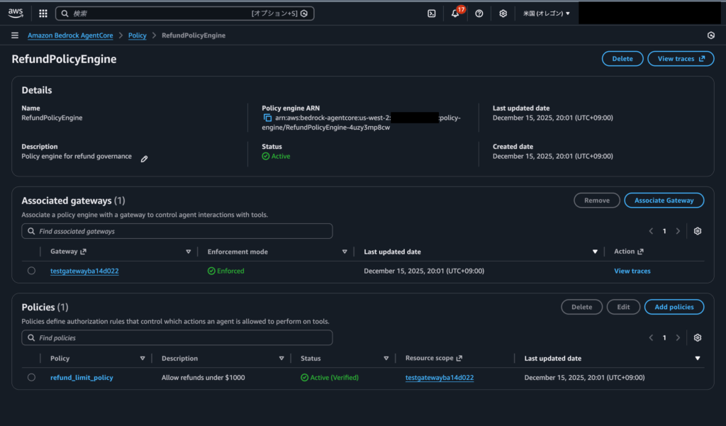 - このハンズオンでは、オレゴンリージョン(us-west-2)にてAgentCore Policyがデプロイされます