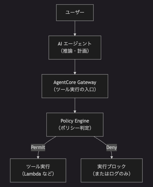 AgentCore Policyは、エージェントに何をしてよいか/してはいけないかを実行前にチェックする仕組みとなります。