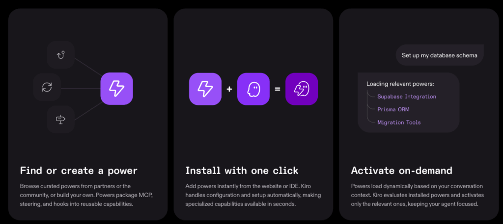 「Kiro Powers」は、MCP(Model Context Protocol)ツール、SteeringファイルやHooksなどのフレームワークに関する知識を、「powers」としてパッケージングしたものになり、AIエージェントが必要なときに、必要な専門知識とツールだけを動的に読み込み、AIエージェントのパフォーマンス向上を図る仕組みとなります。