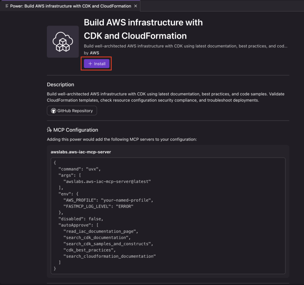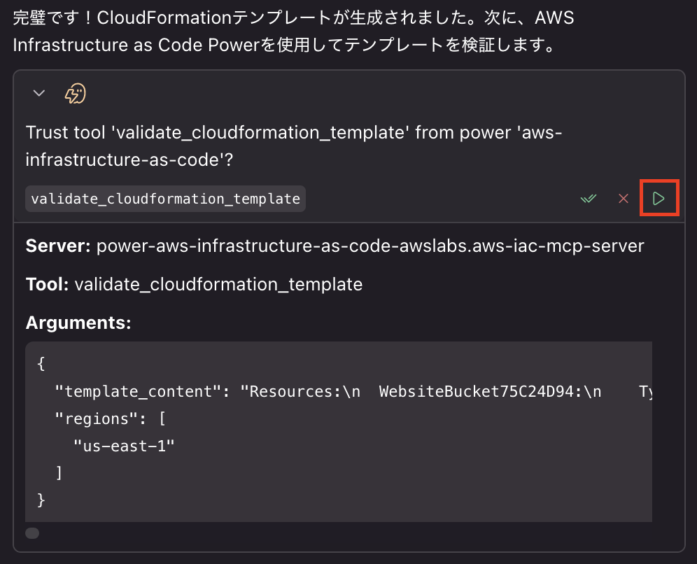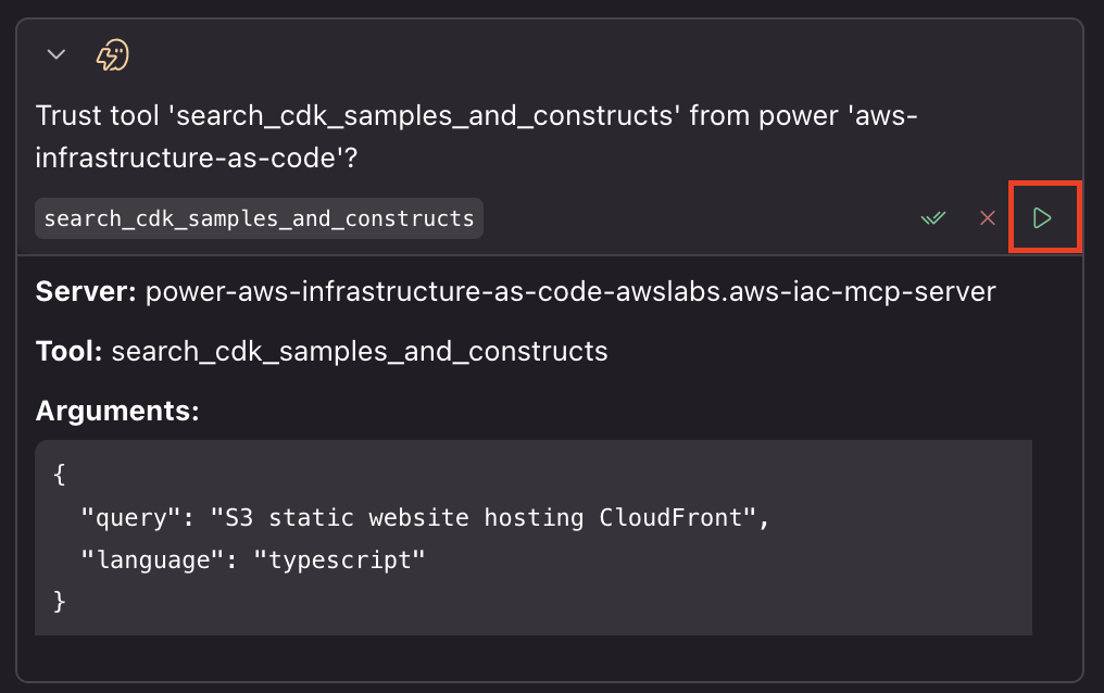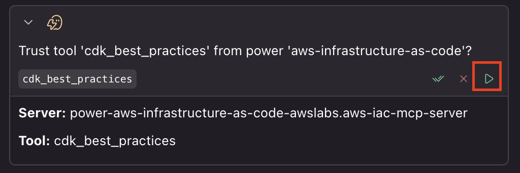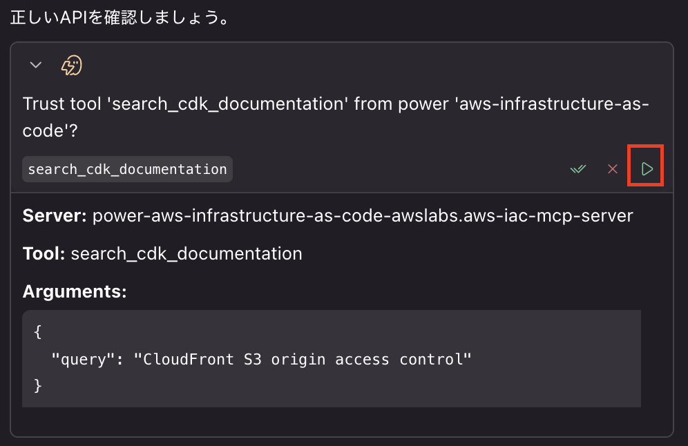 Kiro PowersがCDKドキュメントを確認するとのことなので承認します。