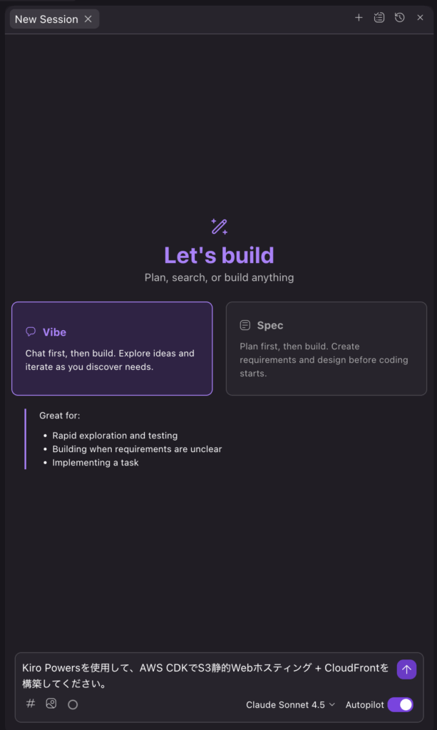 ではKiro Powersを使用してCDKコードを生成してみましょう!