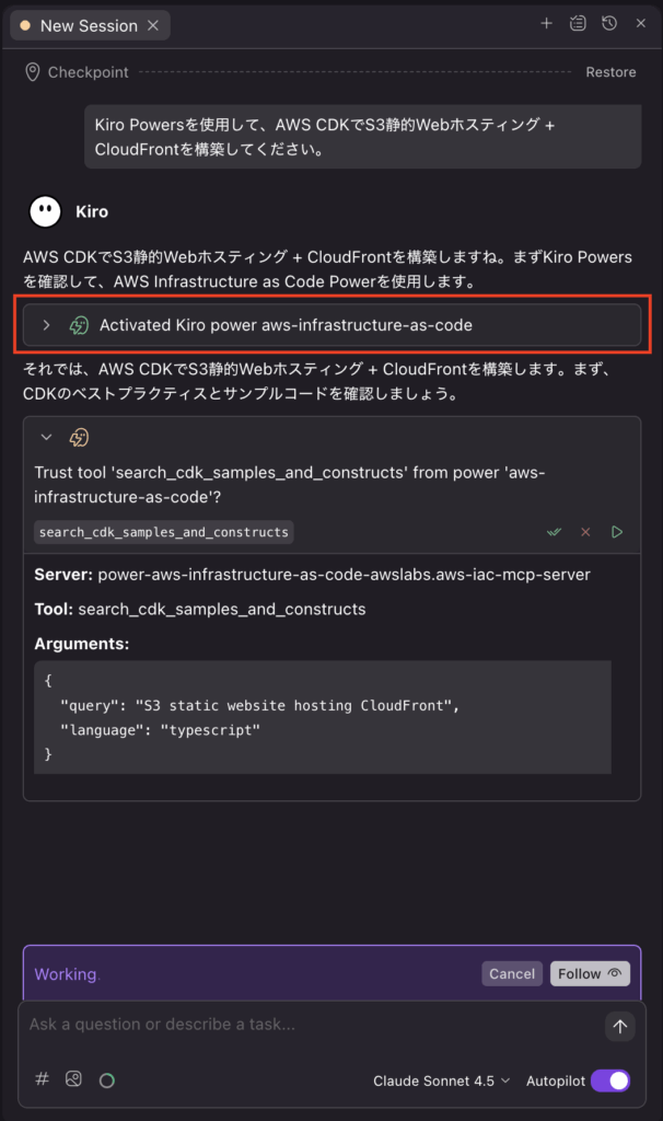 Kiro Powersの提案内容によると、CDKのベストプラクティスとサンプルコードを確認するとのことなので、承認します。
