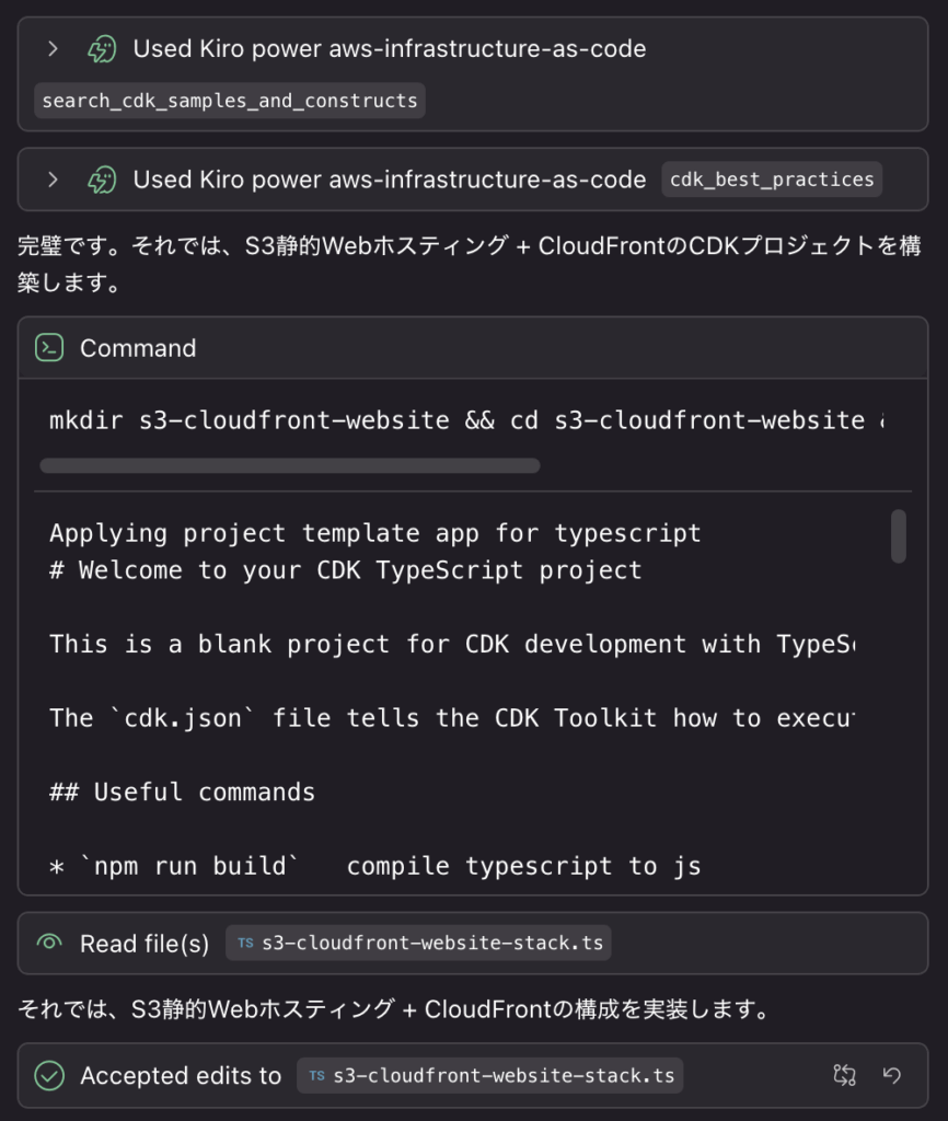 Kiro Powersに作業を依頼して、CDKソースコード実装・検証までが一旦完了しました!