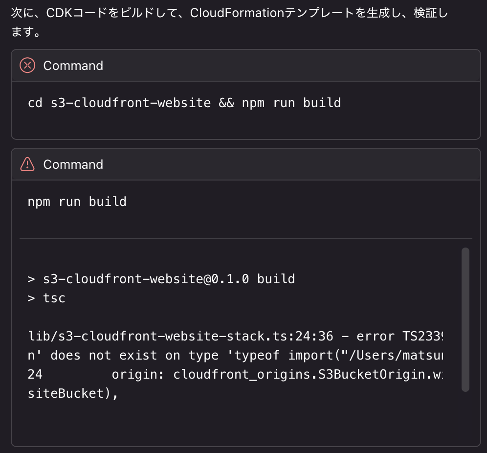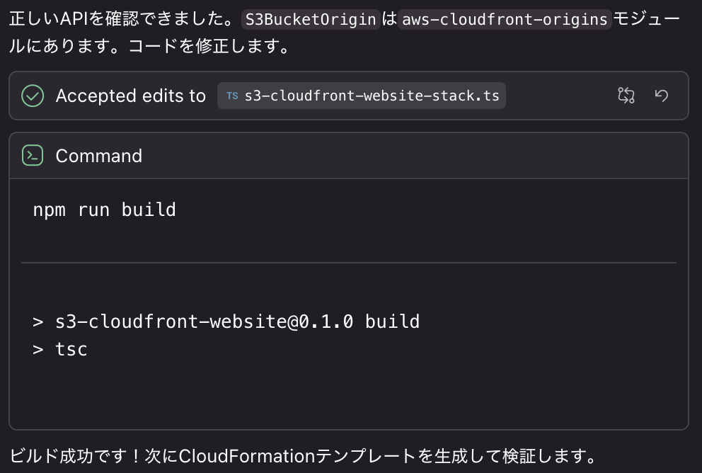 Kiro PowersがCDKドキュメントを確認したことで、ビルド失敗の原因を特定、該当箇所を修正しました。