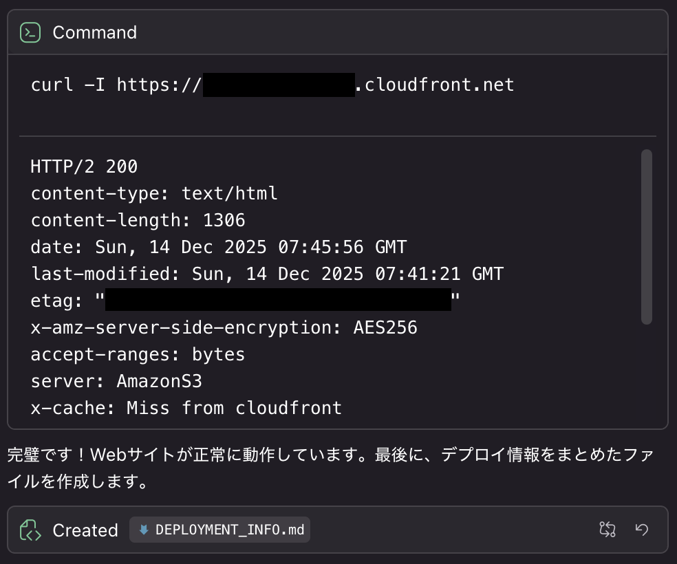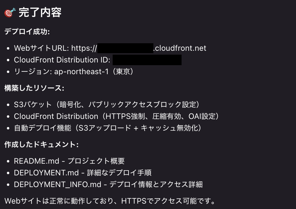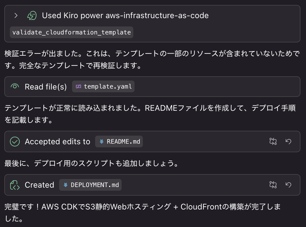 S3静的Webホスティング + CloudFront構成のデプロイが完了したので、Kiro Powersの検証を終えたいと思います。