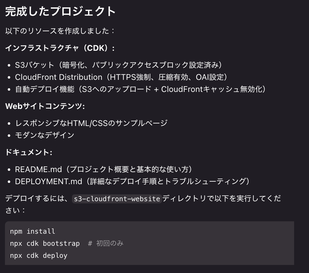 CDKのベストプラクティスとサンプルコードの確認が完了したので、CDKソースコードを生成してもらいます。