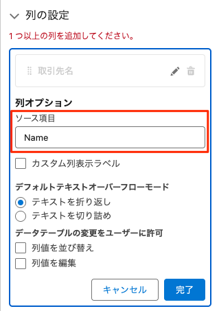 今回はシンプルにName列を電話列のみの設定とします。列の設定のセクションを展開して、最初の列にName列を設定、完了ボタンをクリックします。