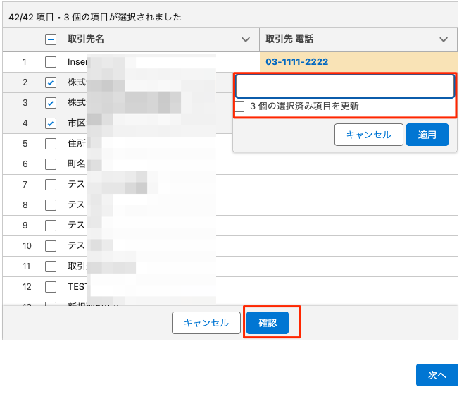 鉛筆マークで編集を始めて、チェックボックスによる複数更新もできそうです。「確認」ボタンを押して「次へ」を押すと更新されます。