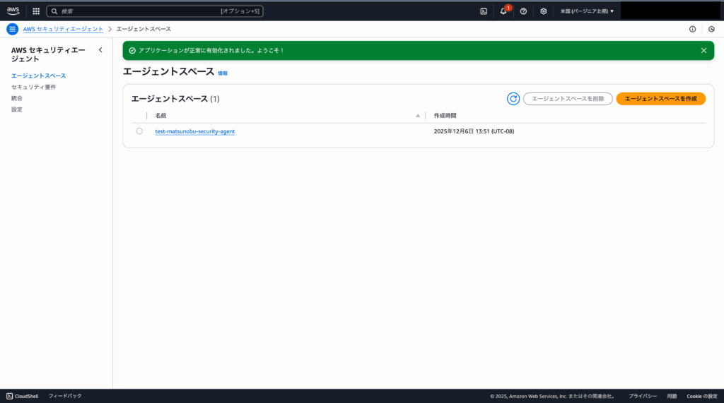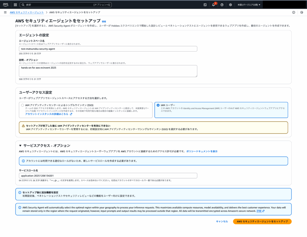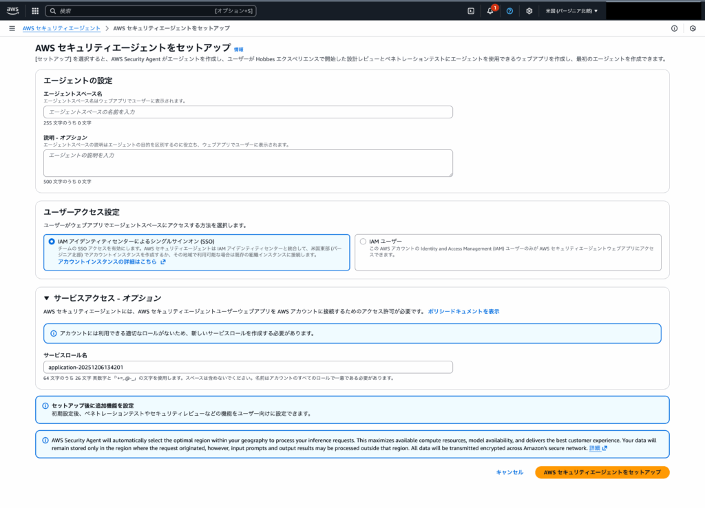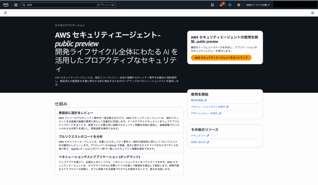 AWS Security Agentは発表時点ではバージニア北部(us-east-1)のみ提供されていますので、必ずリージョンをバージニア北部に指定してください。