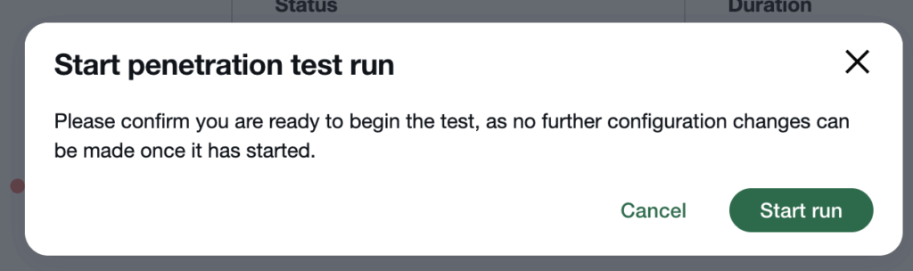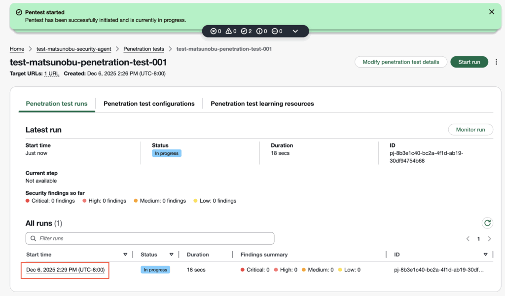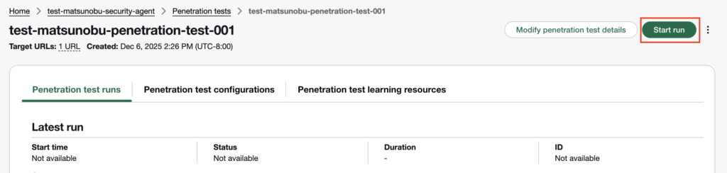 9. 「Start run」を選択しペネトレーションテストを実行する
