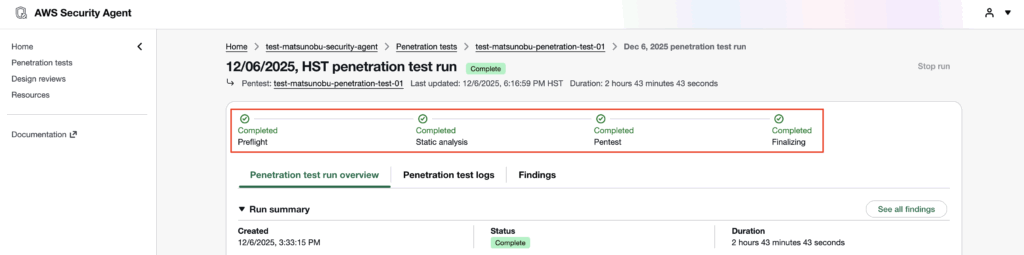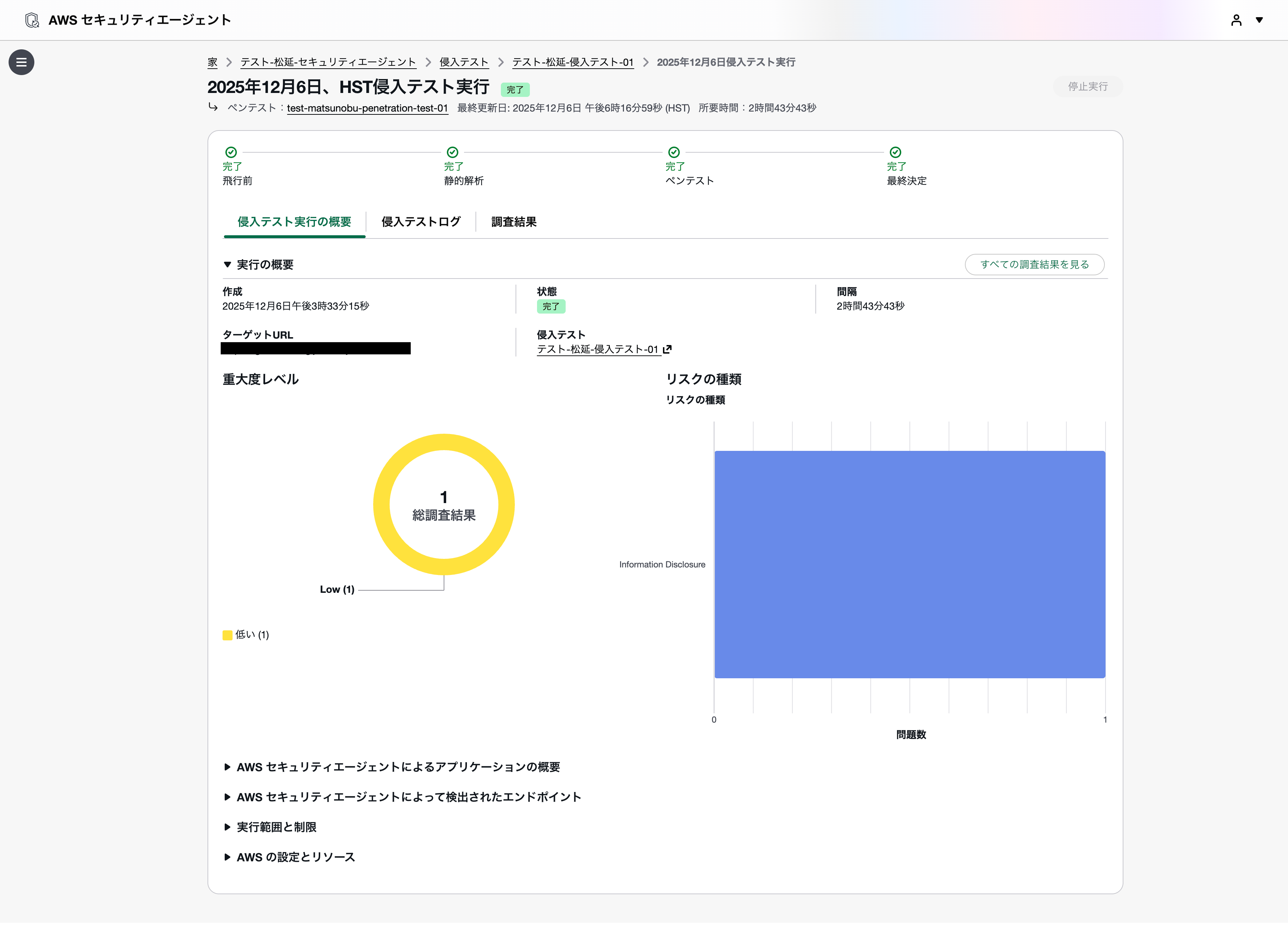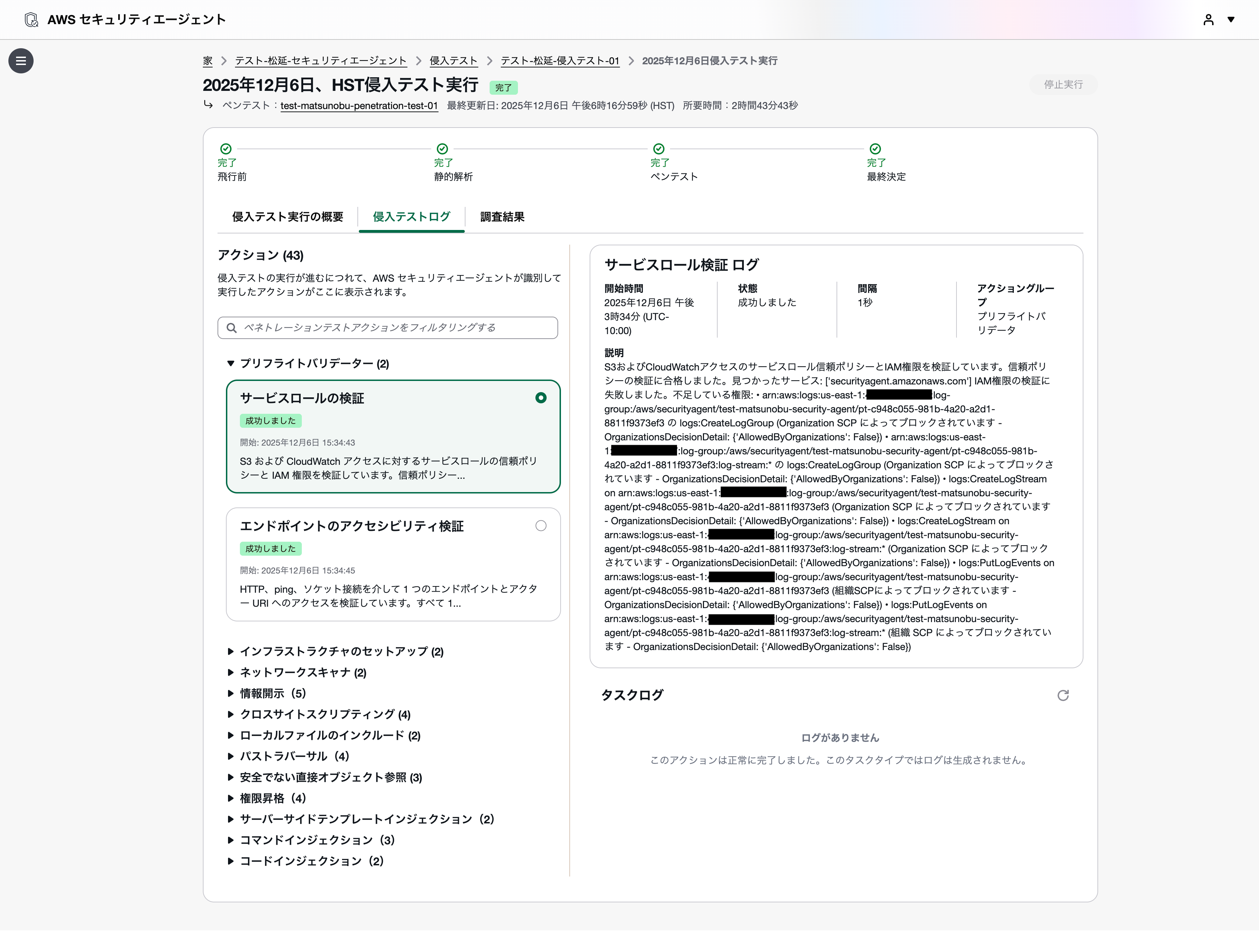 ペネトレーションテスト実行ログを選択すると、ペネトレーションテストの詳細を確認できます。