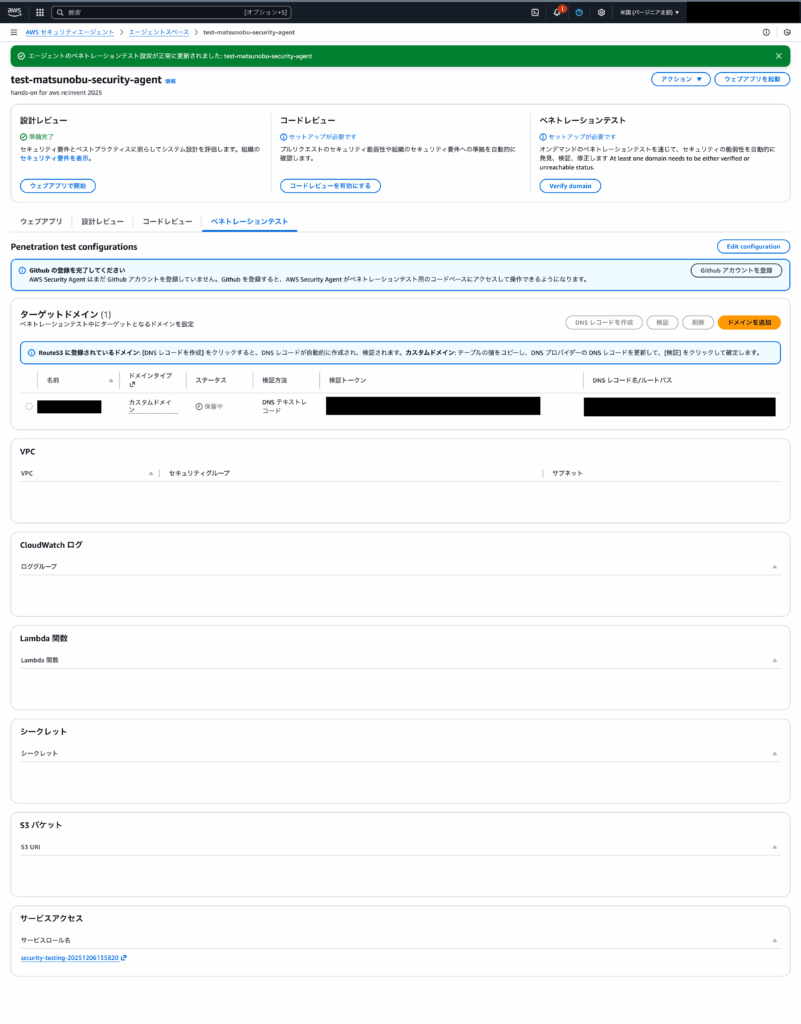 そのため、現時点ではこのドメインについてはセキュリティリスクは低い状態ですが、いずれセキュリティ対応は必要になってくるかと思いますので、AWS Security Agentを用いて定期的にセキュリティ脆弱性について確認する方が良いと思いました。