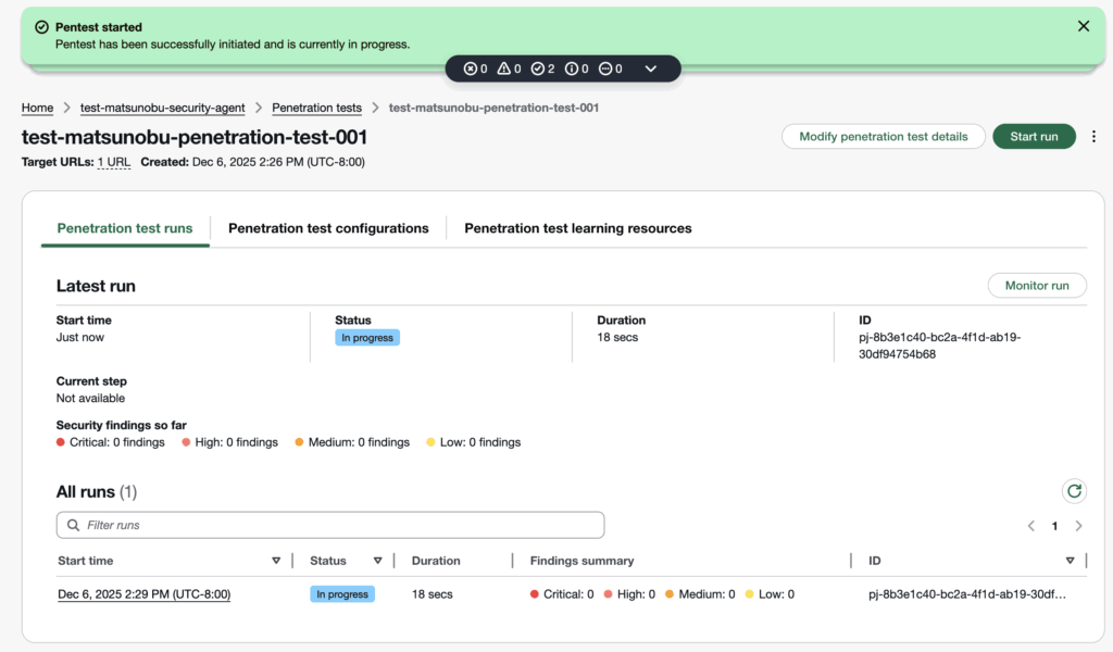 10. ペネトレーションテストが実行され、ステータスが「In progress」になるので、完了するまで待機する