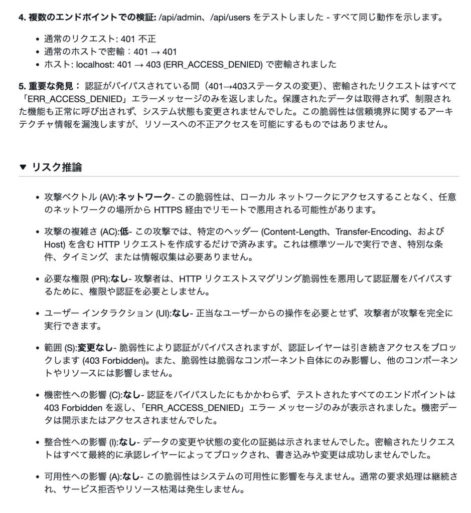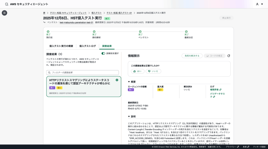 本検証にて使用したドメインについて、AWS Security Agentによるペネトレーションテストをした結果、信頼度はHigh、深刻度はLowでした。