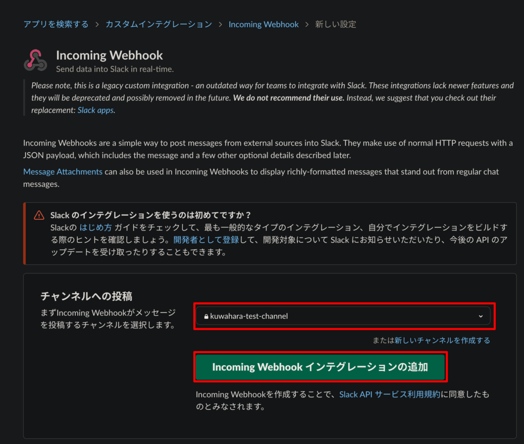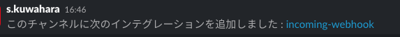 その後、Incoming Webhook インテグレーションの追加ボタンを押下。