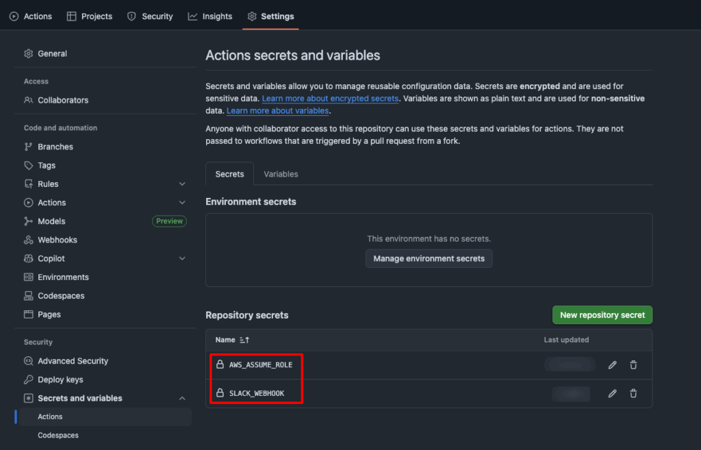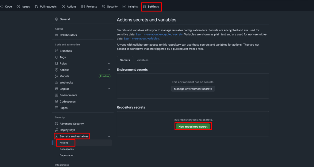 Settings > Secrets and variables > Actionsをクリックし、New repository secretボタンを押下します。