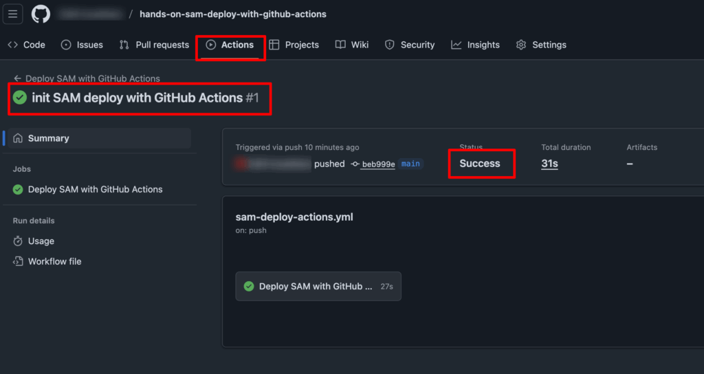 Github Actionsが起動するので完了まで待ち、StatusがSuccessとなれば成功です。
