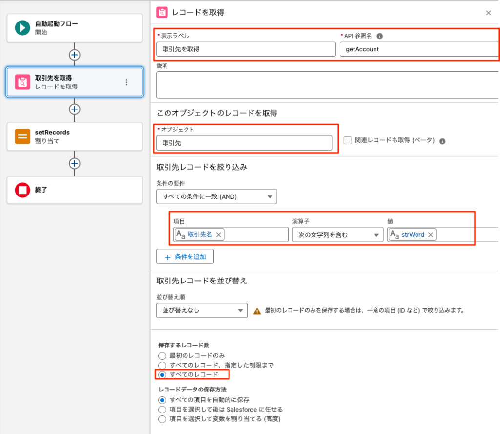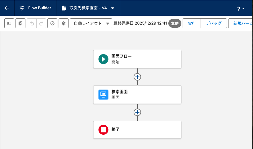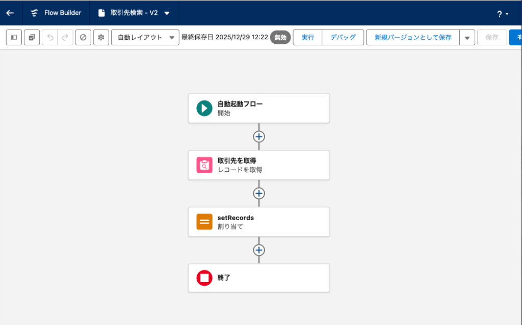 サブフローとして画面フローから呼び出すフローです。中身はこんな感じです。今回は取引先を検索してみます。