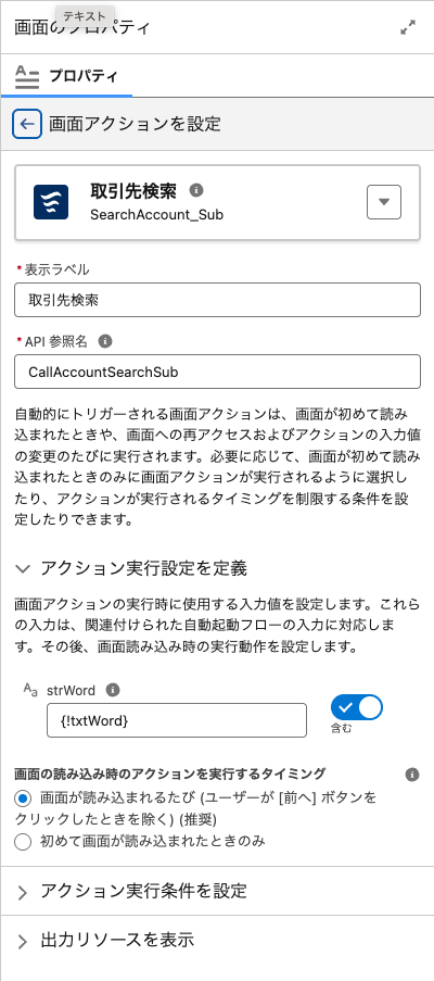 画面アクションを設定:取引先検索(SearchAccount_Sub)
