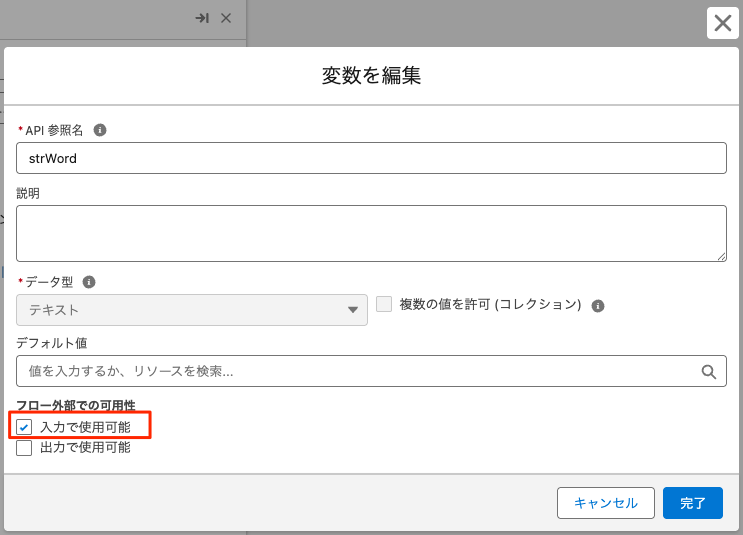 1-1:「入力で使用可能」なテキスト型変数を用意します。変数名は「strWord」とします。