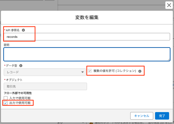 1-3:レコード変数(コレクション)を作成します。レコード型で、「複数の値を許可(コレクション)」、出力で使用可能にチェックします。